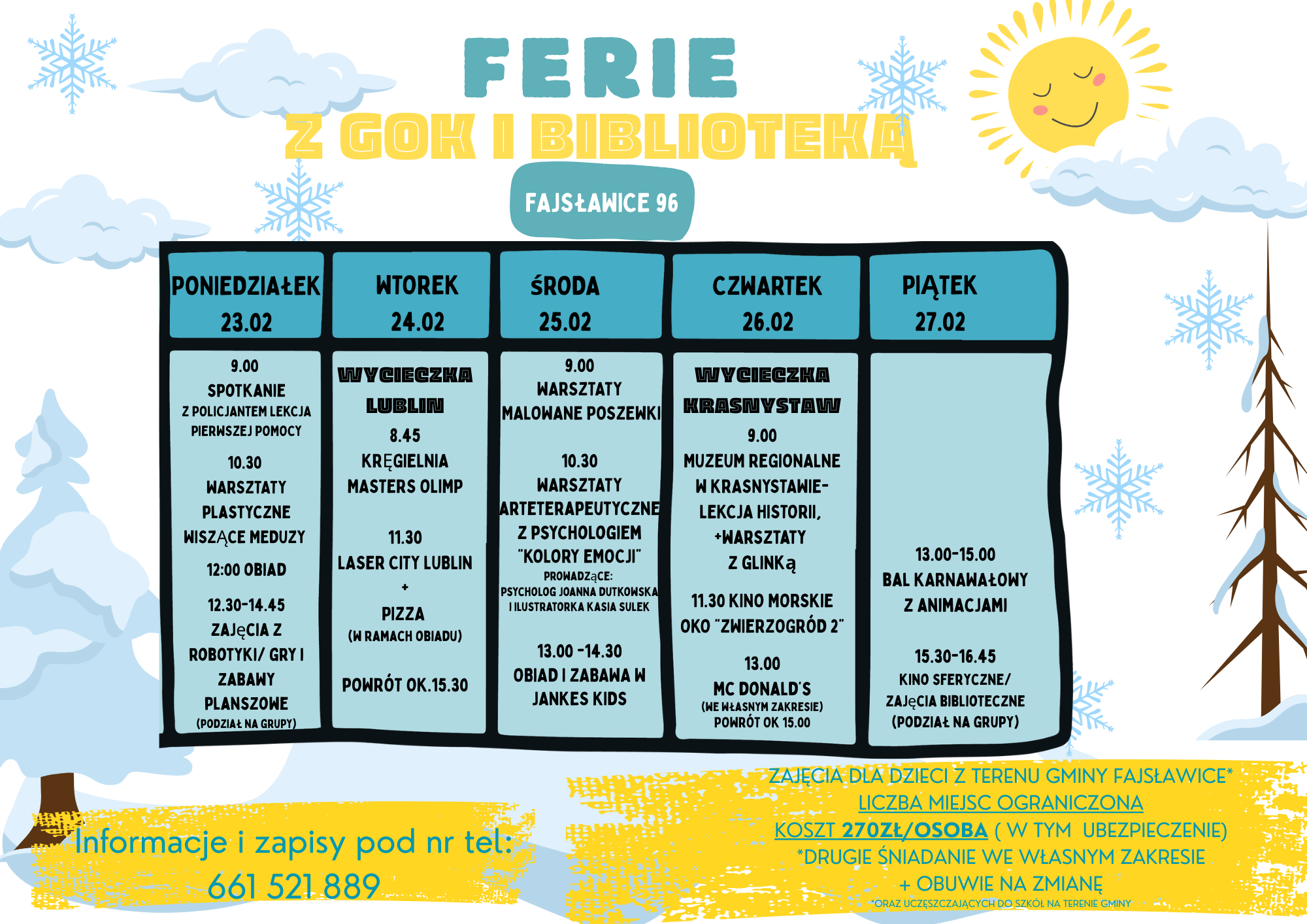 Zapraszamy dzieci z terenu Gminy Fajsławice na pełne atrakcji ferie zimowe organizowane przez GOK i Bibliotekę! Czeka na Was tydzień świetnej zabawy, kreatywnych warsztatów i niezapomnianych wycieczek ![]()