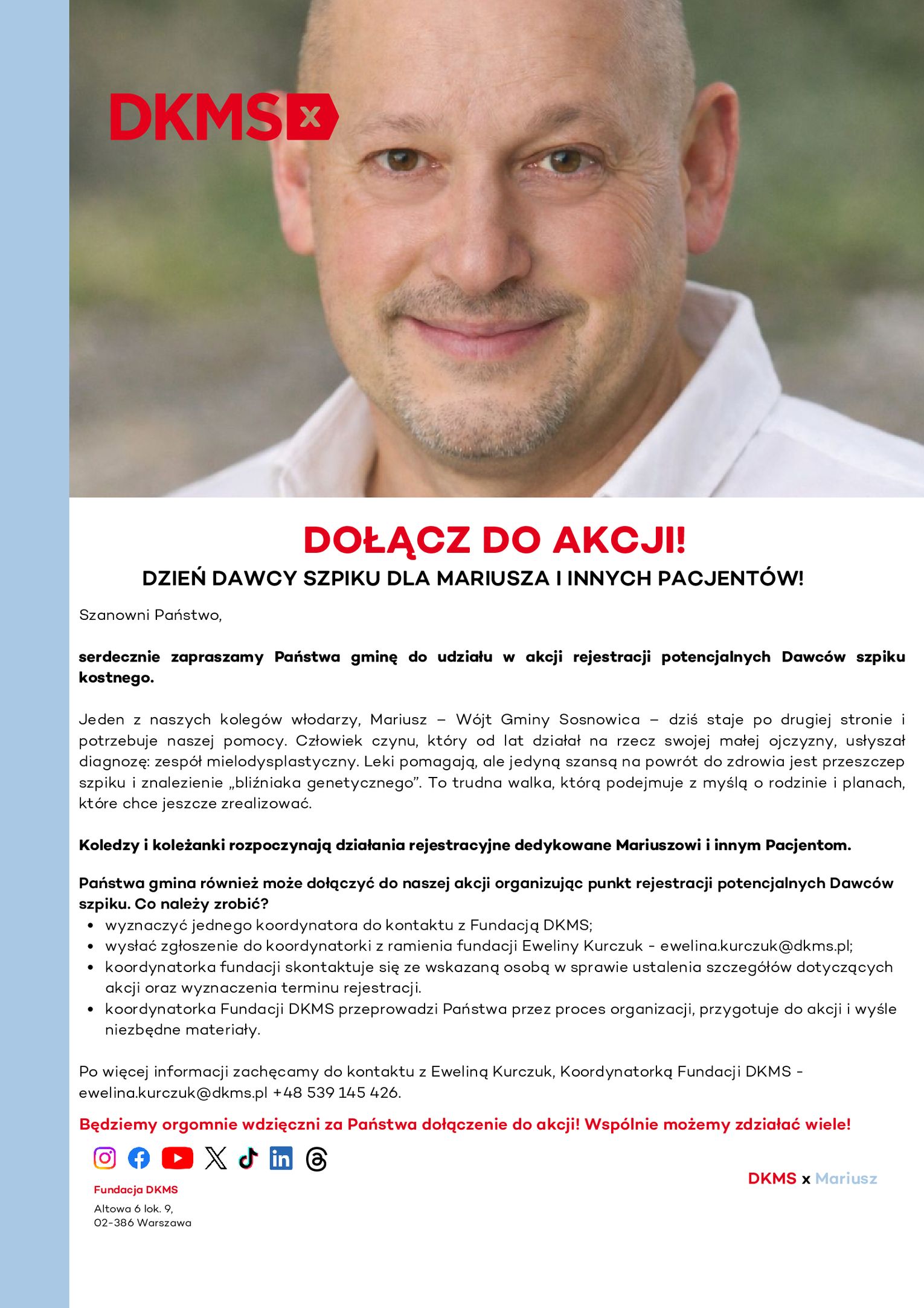 Akcja ma szczególny wymiar. Dedykowana jest Wójtowi Gminy Sosnowica – Mariuszowi Hołowieńcowi, który pilnie potrzebuje przeszczepu i swojego „bliźniaka genetycznego”, ale także wszystkim pacjentom walczącym z nowotworami krwi. Być może właśnie wśród nas znajduje się osoba, która może komuś uratować życie.