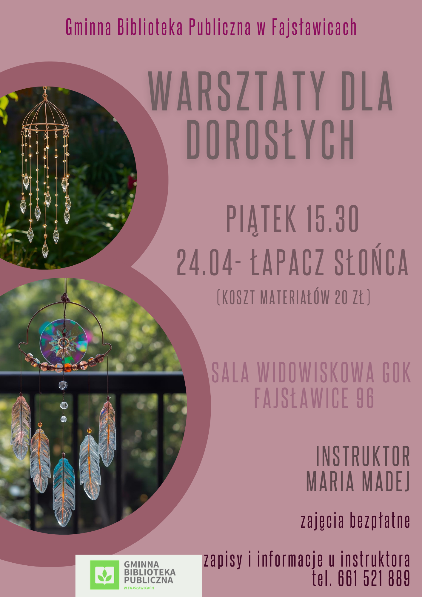 Gminna Biblioteka Publiczna w Fajsławicach zaprasza na kreatywne warsztaty dla dorosłych i młodzieży, podczas których własnoręcznie wykonasz wyjątkowy łapacz słońca – piękną ozdobę, która rozświetli Twoją przestrzeń ![]()